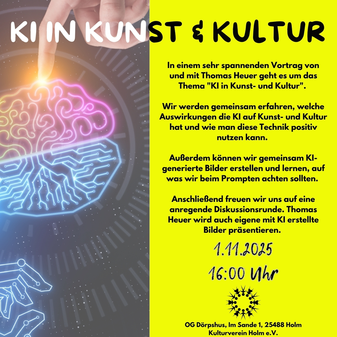 | 01.11.2025, 16 Uhr | Vortrag | kostenfrei | Thema: “KI in Kunst & Kultur“: Wir erfahren, was man mit verschiedenen KIs machen kann, wann man aufpassen muss und probieren uns selber etwas aus. |