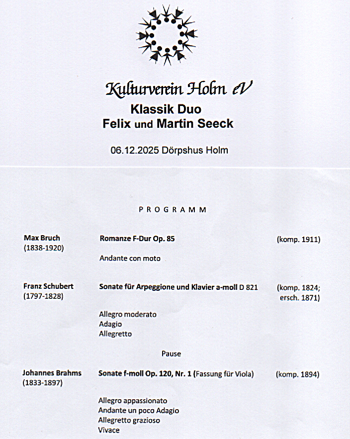 | 06.12.2025 um 17 Uhr | Konzert/ Markt | auf Spendenbasis | Freuen sich ein schönes Konzert mit den beiden Pianisten. Hier finden Sie das Programm für den Abend. |